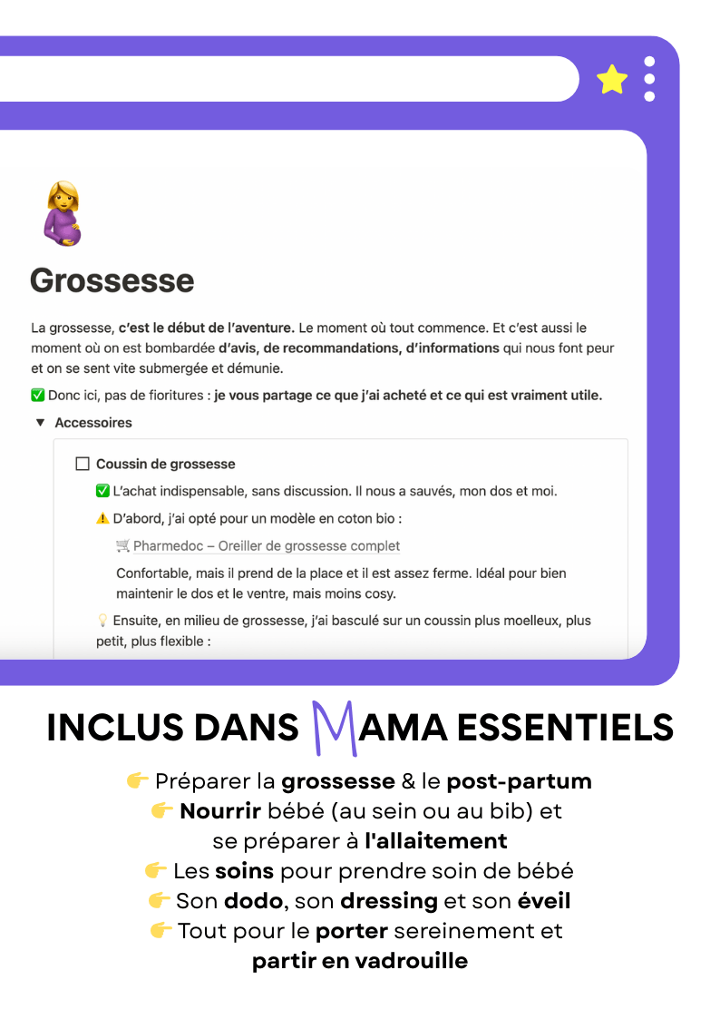 👉 Oui. Il contient aussi des sections pour le post-partum, les débuts avec bébé jusqu'à 1 an, et l’organisation au quotidien.