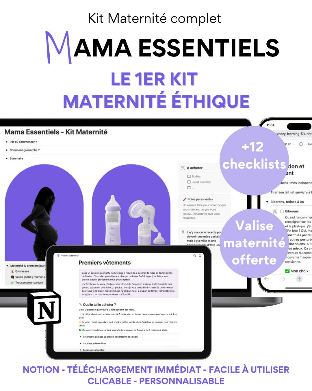👉 Oui. Il contient aussi des sections pour le post-partum, les débuts avec bébé, et l’organisation au quotidien.