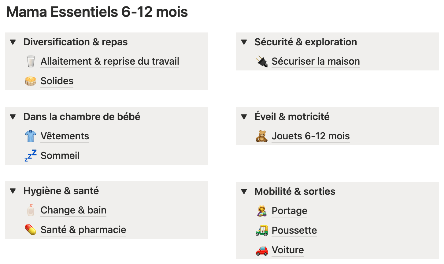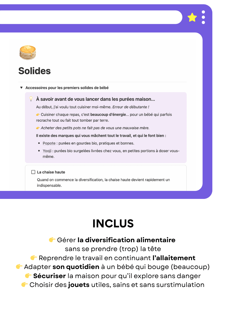 👉 Il vaut mieux vous tourner vers Mama Essentiels, qui contient des sections pour le post-partum, les débuts avec bébé de 0 à 6 mois, et l’organisation au quotidien.